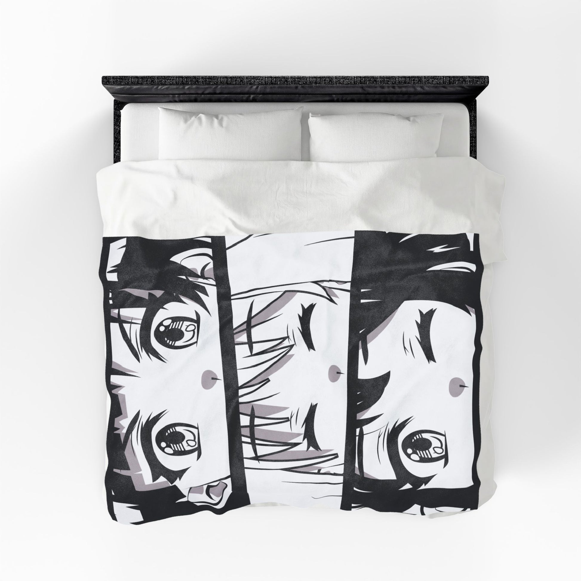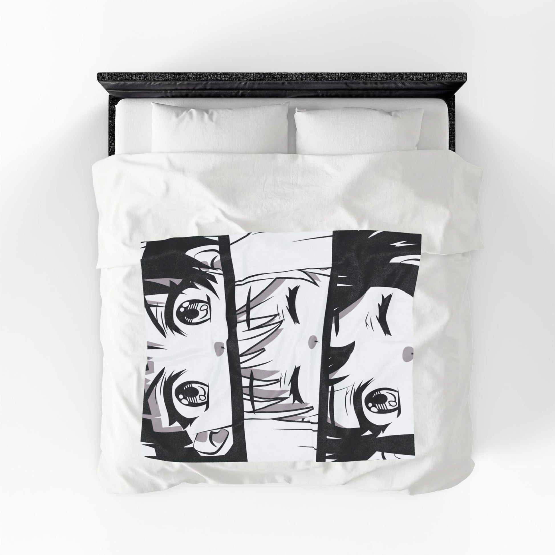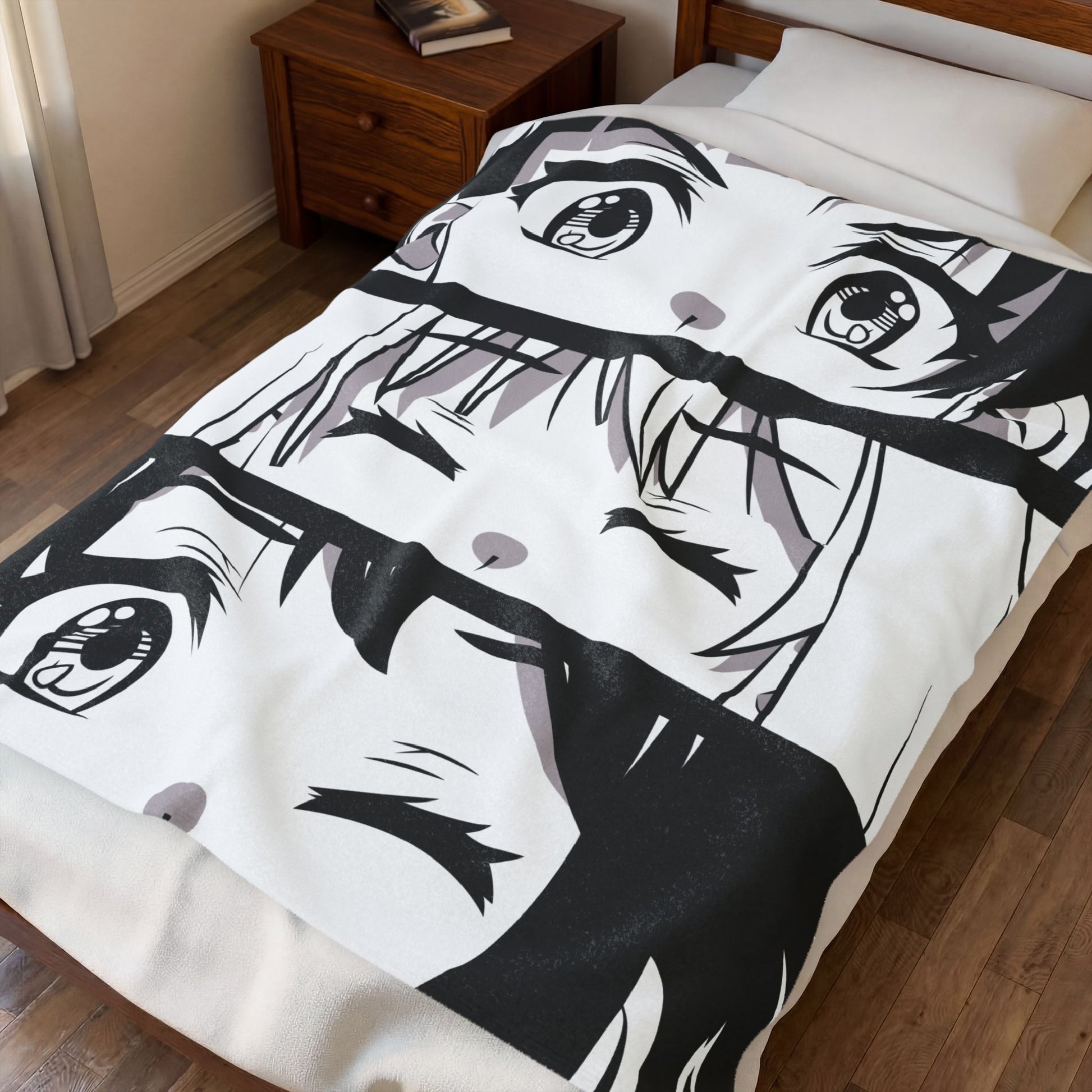 Wrap yourself in a soft, storybook moment with this plush velveteen blanket. The bold black-and-white anime panel print draws the eye, while the velvety surface invites you to curl up and linger. It drapes smoothly across laps and sofas, turning ordinary downtime into a cozy scene—late-night anime marathons, quiet sketching sessions, or slow mornings with coffee. The medium-heavy fabric holds vibrant, high-detail printing on one side so the expressive eyes and playful winks stay crisp wash after wash. Lightweight enough to carry to conventions or friend sleepovers, yet substantial enough to keep you warm on chilly evenings.